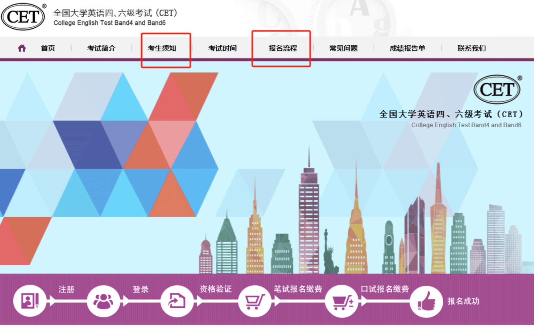 2.考生须提前登陆http://cet-bm.neea.edu.cn网站,点击“考生须知”,下载并认真阅读,熟悉报名和考试相关事项;点击“报名流程”,下载并认真阅读,熟悉报名流程、注册用户流程、密码及账号找回流程。对于候补报名功能,请仔细阅读相关流程。
